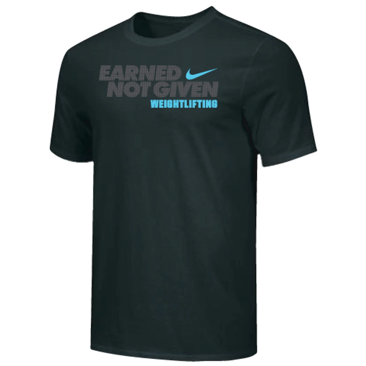 Nike Men’s Weightlifting Earned Not Given Tee – Black/Grey/Blue – Form and function combine for a modernized look with less bulk in the Nike 100% Premium Ring Spun Cotton Tee.