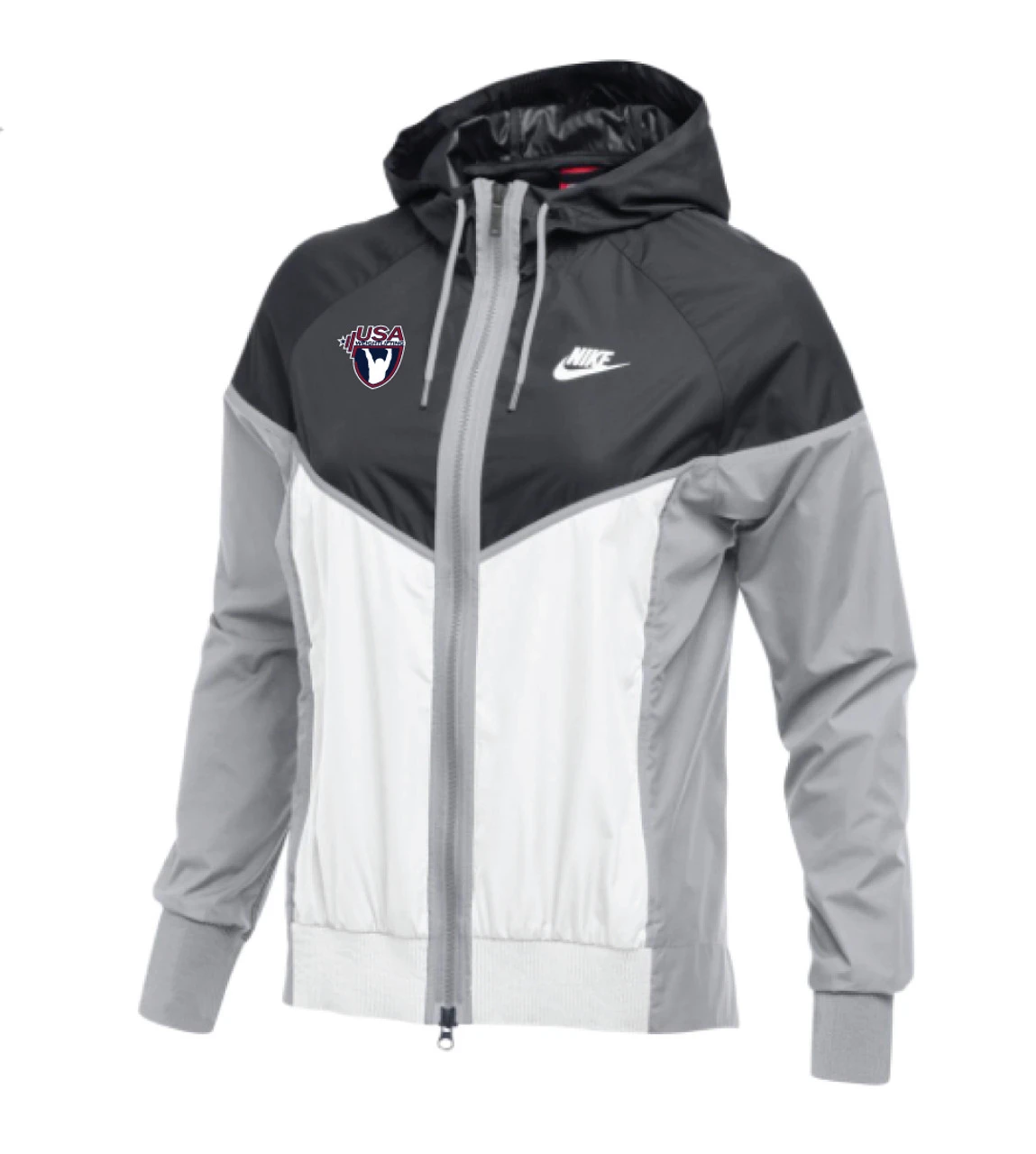 Nike Women’s USA Weightlifting Windrunner Jacket – Anthracite/White – Nike Women’s Weightlifting Windrunner Jacket. Crafted with the iconic chevron on the chest, it features bold color-blocking and a paneled hood for added warmth and coverage.