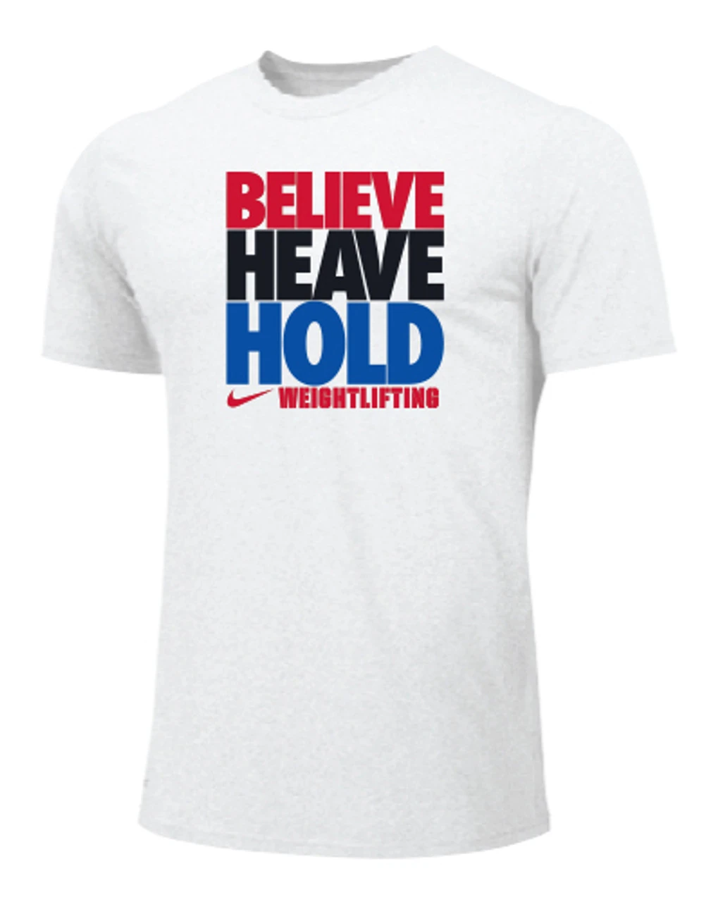 Nike Women’s Weightlifting Believe Heave Hold Tee –Â White/Red/Black/Blue – Form and function combine for a modernized look with less bulk in the Nike 100% Premium Ring Spun Cotton Tee.